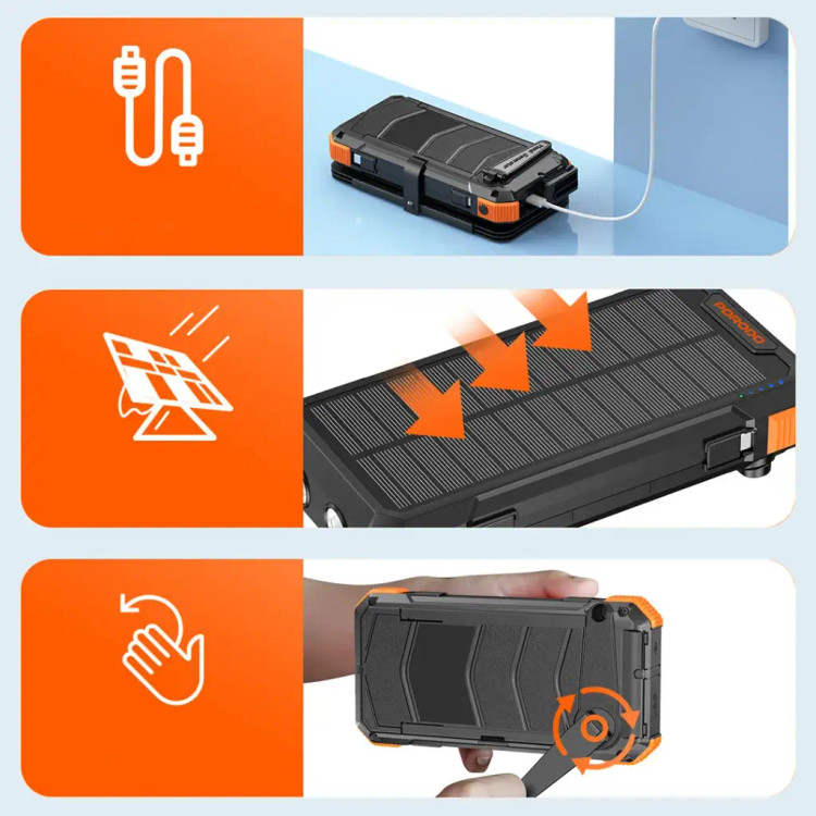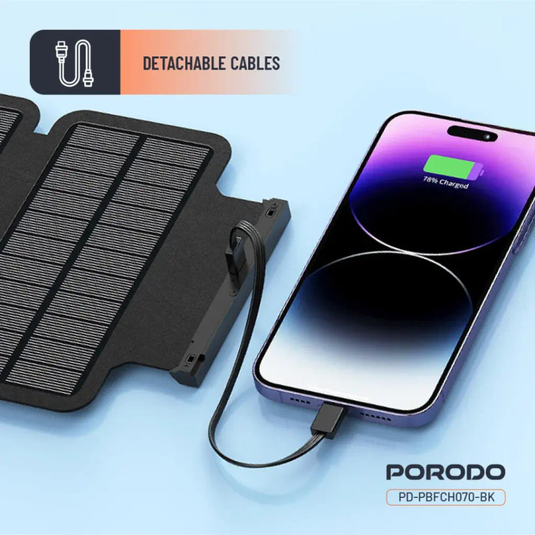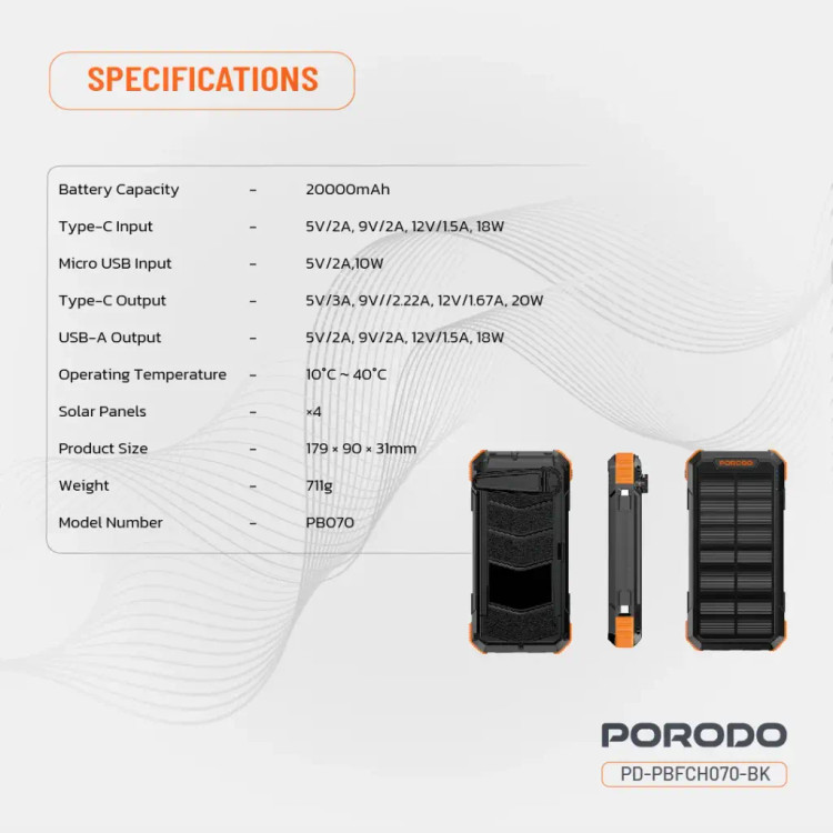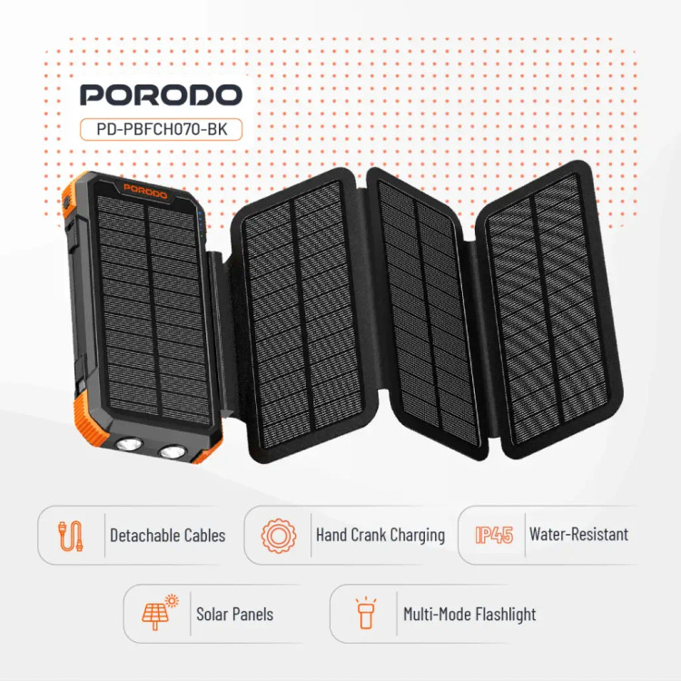 پاوربانک Porodo با ظرفیت ۲۰۰۰۰ میلیآمپر ساعت و ۴ پنل خورشیدی، یکی از قدرتمندترین و همهکارهترین راهحلهای شارژ برای استفاده در فضای باز یا مواقع اضطراری است. این یکی از دستگاههایی است که میتوانید برای باتری پشتیبان در یک باتری بزرگ ۲۰۰۰۰ میلیآمپر ساعتی روی آن حساب کنید. این دستگاه با ورودیها و خروجیهایی از جمله Type-C، Micro USB و USB-A عرضه میشود. این دستگاه میتواند تا ۲۰ وات شارژ سریع داشته باشد و از PD 20 وات پشتیبانی میکند. میتوانید پاوربانک را از طریق نور خورشید با یک سیستم خورشیدی ۴ پنلی داخلی شارژ کنید که برای استفاده در فضای باز عالی است. این گجت دارای ویژگیهایی مانند شارژ با هندل دستی، چراغ قوه در حالتهای مختلف و کابلهای قابل جدا شدن است. این دستگاه برای همه شرایط سخت ایدهآل است زیرا دارای IP45 در برابر آب است و بین دمای -۱۰ درجه سانتیگراد و ۴۰ درجه سانتیگراد کار میکند.