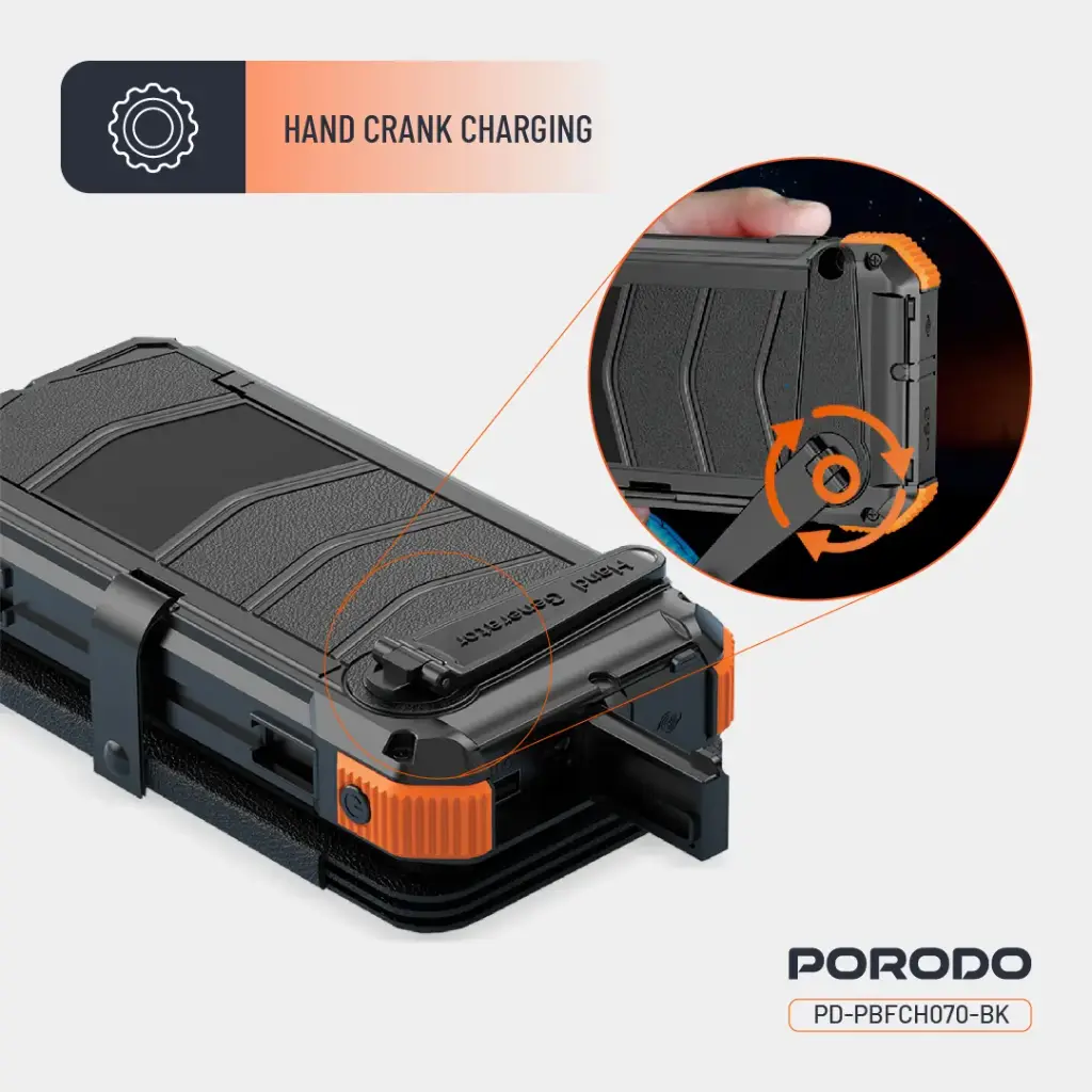 پاوربانک Porodo با ظرفیت ۲۰۰۰۰ میلیآمپر ساعت و ۴ پنل خورشیدی، یکی از قدرتمندترین و همهکارهترین راهحلهای شارژ برای استفاده در فضای باز یا مواقع اضطراری است. این یکی از دستگاههایی است که میتوانید برای باتری پشتیبان در یک باتری بزرگ ۲۰۰۰۰ میلیآمپر ساعتی روی آن حساب کنید. این دستگاه با ورودیها و خروجیهایی از جمله Type-C، Micro USB و USB-A عرضه میشود. این دستگاه میتواند تا ۲۰ وات شارژ سریع داشته باشد و از PD 20 وات پشتیبانی میکند. میتوانید پاوربانک را از طریق نور خورشید با یک سیستم خورشیدی ۴ پنلی داخلی شارژ کنید که برای استفاده در فضای باز عالی است. این گجت دارای ویژگیهایی مانند شارژ با هندل دستی، چراغ قوه در حالتهای مختلف و کابلهای قابل جدا شدن است. این دستگاه برای همه شرایط سخت ایدهآل است زیرا دارای IP45 در برابر آب است و بین دمای -۱۰ درجه سانتیگراد و ۴۰ درجه سانتیگراد کار میکند.